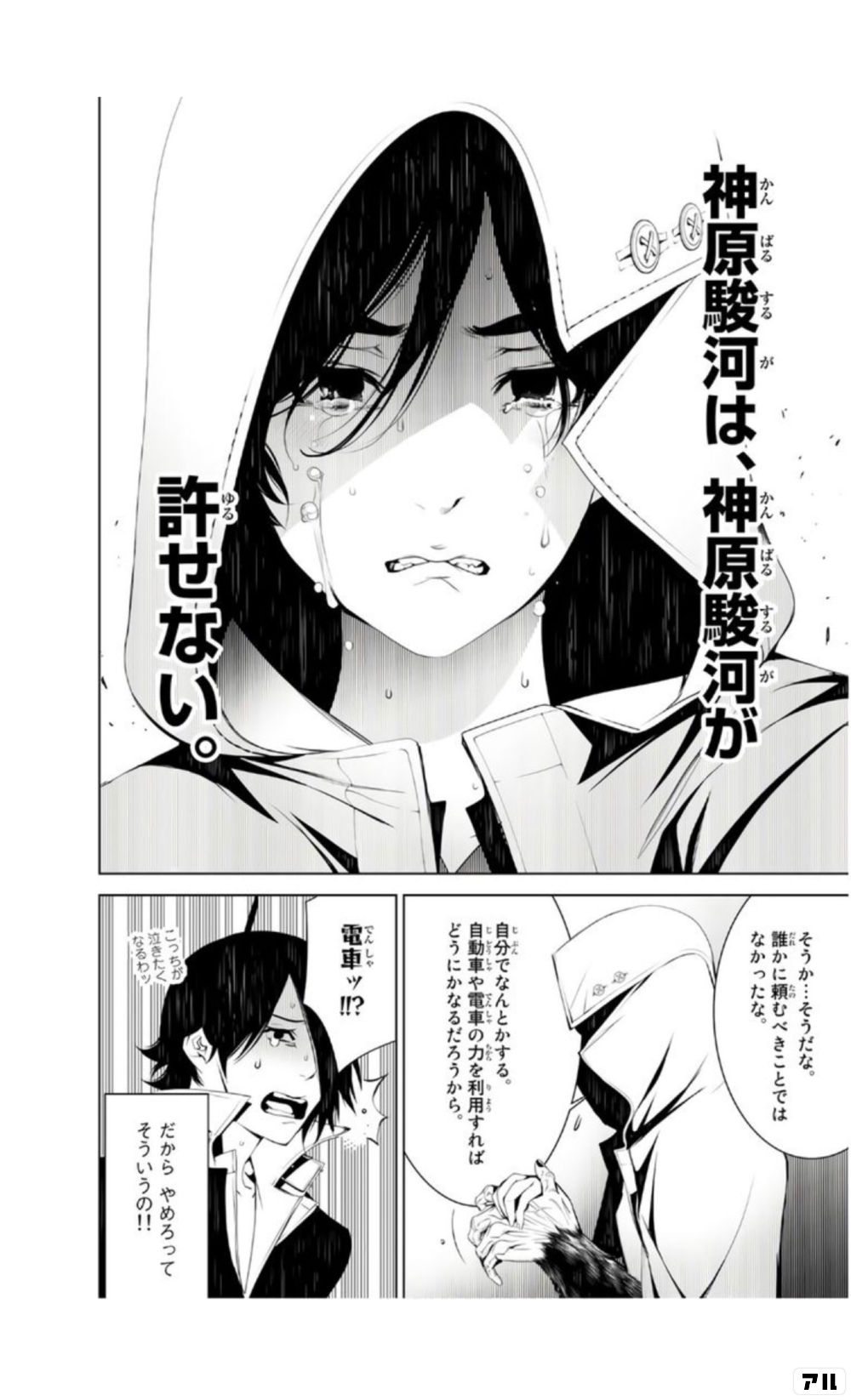 神原駿河は 神原駿河が 許せない そうか そうだな 誰かに頼むべきことでは なかったな 自分でなんとかする 自動車や電車の力を利用すれば どうにかなるだろうから 電車ッ だからやめろって そういうの 化物語 アル